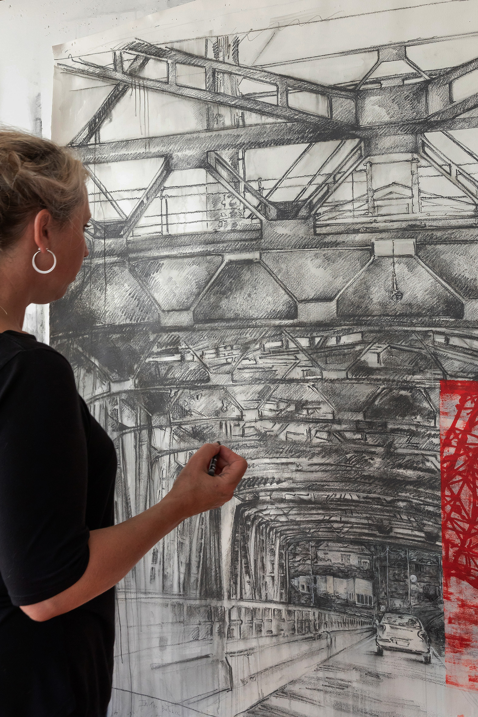 The figure in the landscape recurs throughout her work, functioning as self-portraiture and a symbol of experience within place. Line is her primary language; fluid, expressive, and intuitive, guiding each work through a process that is both spontaneous and deliberate, transforming the intangible into something tangible.